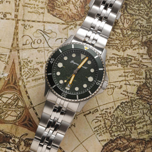 This robust diver is dipped in the colours of a neo-vintage Gallic holiday. Built with intent and dedication, this is a watch with subtle echoes of colour, charm and character throughout the timepiece.