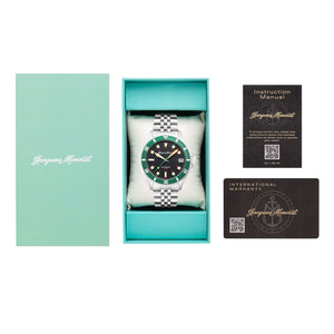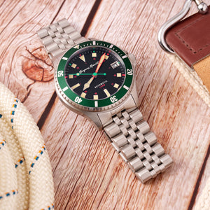 A fun, original timepiece that looks back at the flair, style, and character of traditional skin-diver watches, while injecting them with a twist and a resolute foundation of quality and workmanship. Durable, enduring, and dipped in a tropical diver watch style that's a celebration and echo of the waters of the Caribbean.